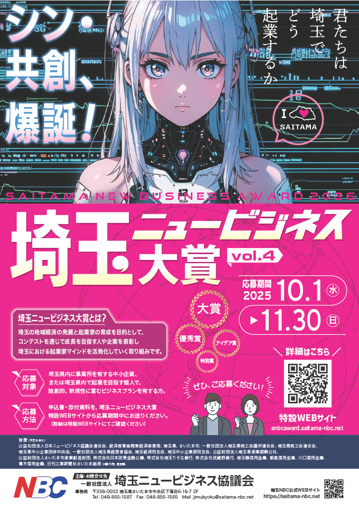 埼玉の地域経済の活性化と起業家の育成を目的とし、革新的かつ市場性のある新事業にチャレンジする起業家を表彰・支援する取り組みです。